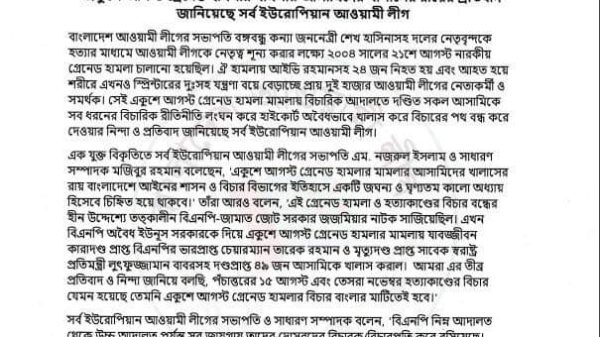 একুশে আগস্ট গ্রেনেড হামলার মামলার আসামিদের খালাসের রায়ের তীব্র নিন্দা ও প্রতিবাদ জানিয়েছে সর্ব ইউরোপিয়ান আওয়ামী লীগ রিপোর্টঃ- দৈনিক বাংলার মুক্তকন্ঠ-? বাংলাদেশ আওয়ামী লীগের সভাপতি বঙ্গবন্ধু কন্যা জননেত্রী শেখ হাসিনাসহ