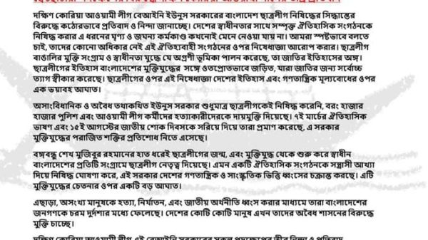 বাংলাদেশ ছাত্রলীগের ওপর নিষেধাজ্ঞা আরোপ এবং অবৈধ ইউনুস সরকারের স্বেচ্ছাচারী পদক্ষেপের বিরুদ্ধে দক্ষিণ কোরিয়া আওয়ামী লীগের তীব্র প্রতিবাদ