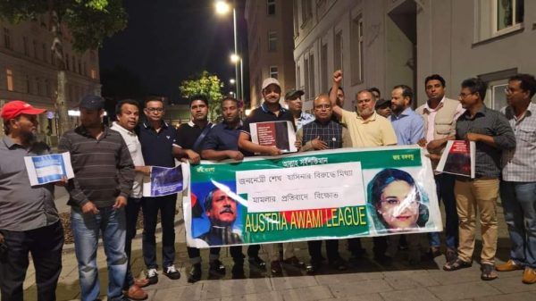 সাবেক প্রধানমন্ত্রী জননেত্রী শেখ হাসিনার বিরুদ্ধে মিথ্যা মামলার প্রতিবাদে ভিয়েনার রাস্তায় মানববন্ধন।