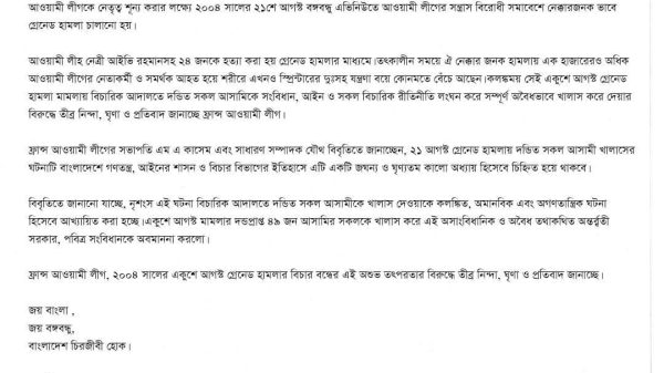 ২১আগস্ট মামলার সকল আসামিদের কে খালাসের ঘটনায় তীব্র নিন্দা ও প্রতিবাদ জানিয়েছেন