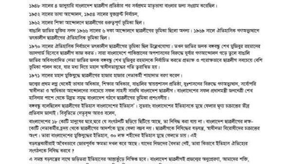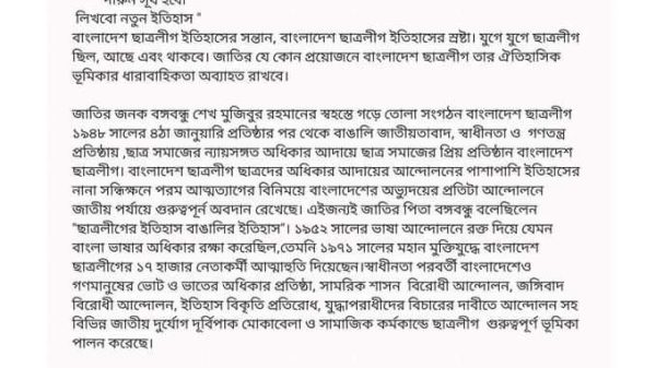 “ছাত্রলীগের ইতিহাস বাঙালির ইতিহাস” -জাতির পিতা বঙ্গবন্ধু শেখ মুজিবুর রহমান। প্রতিবেদনঃ-দৈনিক বাংলার মুক্তকন্ঠ।। যতবারই হত্যা করো জন্মাবো আবার”দারুন সূর্য হবো লিখবো নতুন ইতিহাস” বাংলাদেশ ছাত্রলীগ ইতিহাসের সন্তান,বাংলাদেশ ছাত্রলীগ ইতিহাসের স্রষ্টা।