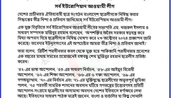 ছাত্রলীগকে নিষিদ্ধ করার সিদ্ধান্তের তীব্র নিন্দা ও প্রতিবাদ জানিয়েছে সর্ব ইউরোপিয়ান আওয়ামী লীগ স ম জিয়াউর রহমান : দেশের প্রাচীনতম ঐতিহ্যবাহী ছাত্র সংগঠন বাংলাদেশ ছাত্রলীগকে নিষিদ্ধ করার সিদ্ধান্তের তীব্র নিন্দা