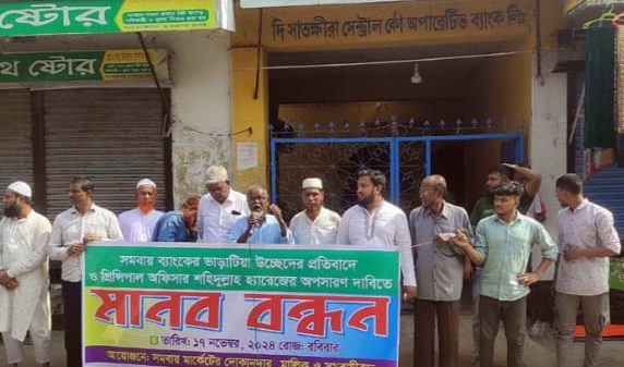 সমবায় ব্যাংকের ভাড়াটিয়া উচ্ছেদের নোটিশের প্রতিবাদে মানববন্ধন