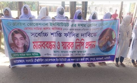 স্কুলছাত্রী আনিকা হত্যার বিচার দাবীতে মনোহরদীতে মানববন্ধন মো.এমরুল ইসলাম,ষ্টাফ রিপোর্টার,নরসিংদীঃ— নরসিংদীর মনোহরদী উপজেলার কৃষ্ণপুর টেক্সটাইল ভোকেশনাল ইনস্টিটিউটের ছাত্রী সামিয়া আলম আনিকার হত্যাকারীদের বিচারের দাবিতে মানববন্ধন করেছেন প্রতিষ্ঠানটির শিক্ষক,শিক্ষার্থীও অভিভাবকরা। বৃহস্পতিবার