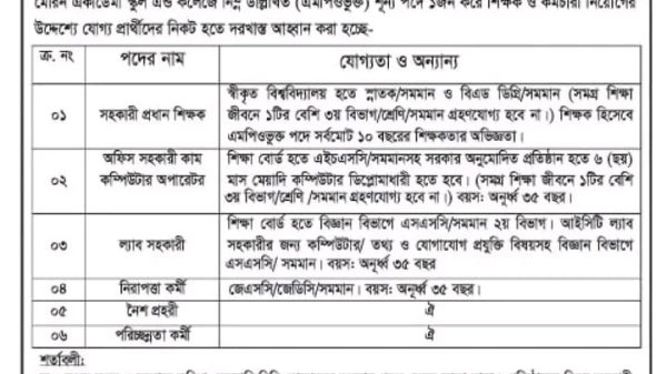 বাংলাদেশ মেরিন একাডেমির স্কুল এন্ড কলেজের (এমপিও ভুক্ত) শুন্য পদে ১জন করে শিক্ষক ও কর্মচারী নিয়োগ বিজ্ঞপ্তি চট্টগ্রাম প্রতিনিধি আহমদ রেজা :- (এমপিও ভুক্ত) শূন্য পদে বাংলাদেশ মেরিন একাডেমির স্কুল read more